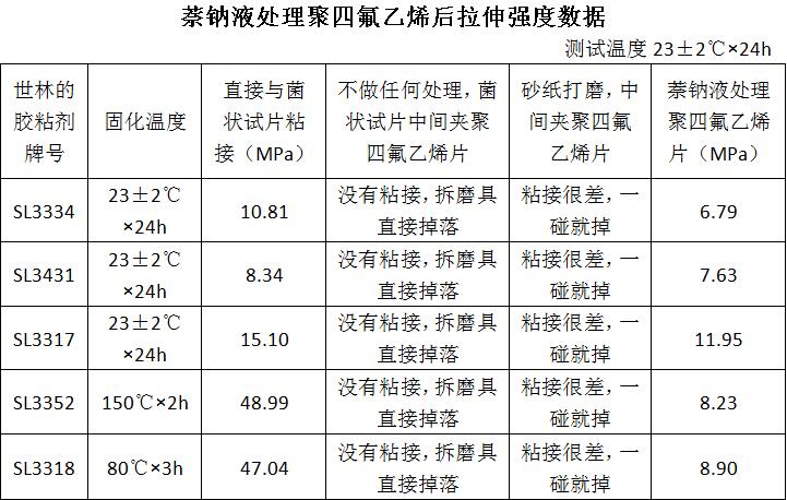 1.經(jīng)萘鈉液處理之后的5種膠粘接強(qiáng)度明顯要高于不做處理的,至于這五種種環(huán)氧膠的粘接對(duì)比此數(shù)據(jù)可能存在一定的偏差,目前就測試后的數(shù)據(jù)來看是SL3317最好。因?yàn)橛行┠>叩倪吘墰]有與PTFE粘到一起。