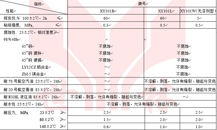 XY101各型密封膏為不干性粘彈型液態(tài)密封墊,它具有耐水、耐水與乙二醇或水與甲醇的混合物,耐汽油、噴氣燃料、礦物油、合成潤滑油、耐渦輪發(fā)動機(jī)燃燒產(chǎn)物等,它適合于航空發(fā)動機(jī)的附件機(jī)匣與壓氣機(jī)機(jī)匣結(jié)合面、附件機(jī)匣與附件安裝面等處的密封。也適合于其它發(fā)動機(jī)、大型機(jī)械或設(shè)備的相關(guān)部位密封。通常其密封間隙應(yīng)小于0.04mm。但不適合于大間隙以及薄壁焊接件及沖壓件的結(jié)合面密封,也不適于帶坡度的結(jié)合面密封。其工作溫度為-50~+250℃,短期可達(dá)300℃。